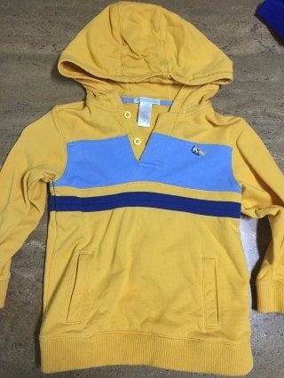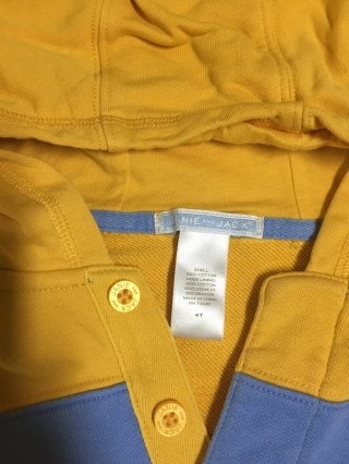 노란색과 하늘색이 어우러진 후드티입니다. 색상은 두번째 사진과 비슷하고 약간 도톰한 편이예요. 몇번 입지 않았으나 세탁해서 사용감이 드네요.