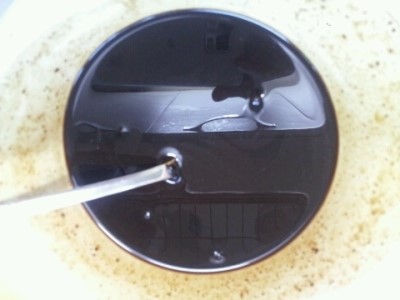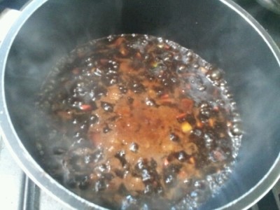 따신물에 짜장분말 부어 저어 풀어놓고~