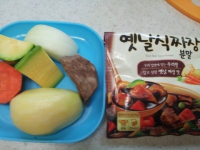 짜장 : 자장분말.감자,호박,당근,양파,소고기,감자전분,물