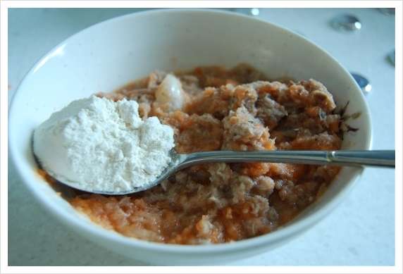 ③다진 고등어와 두부, 당근, 양파를 섞고 소금과 후추로 간을 한다